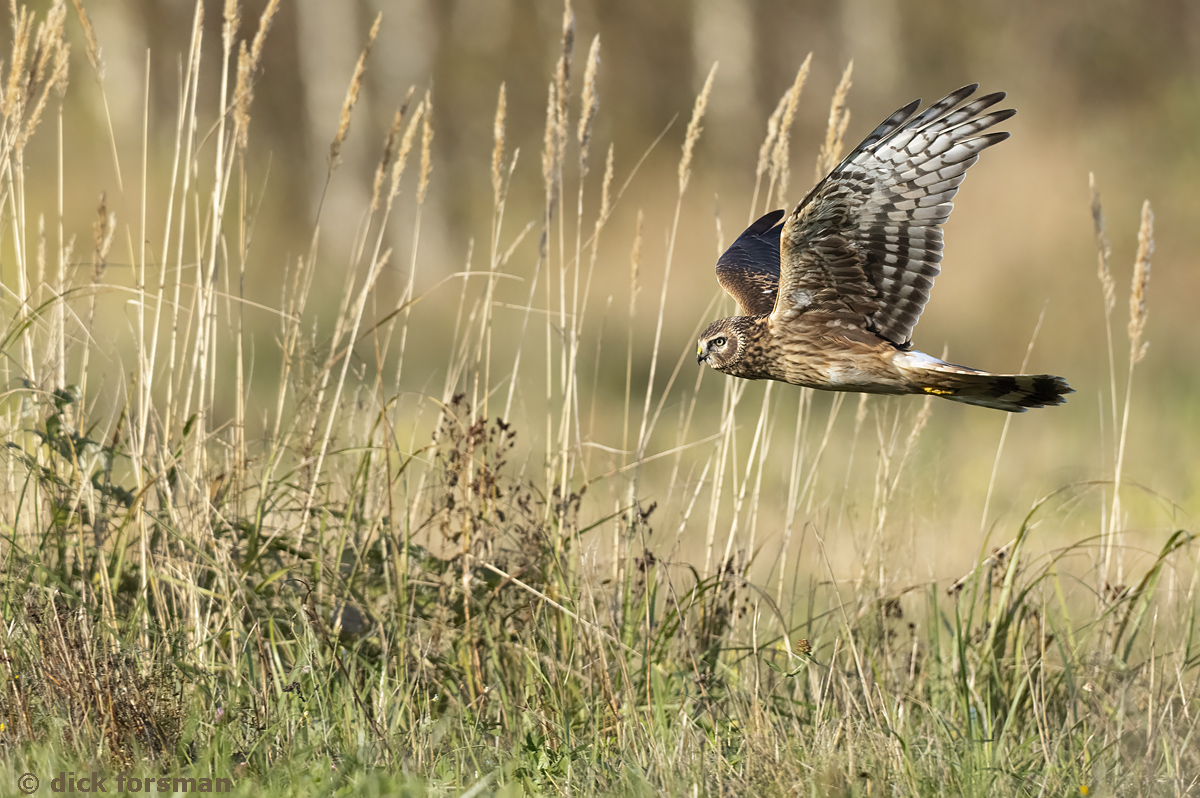 A migrant young male Hen Harrier (Circus cyaneus) looks for supper as the sun is setting. |
