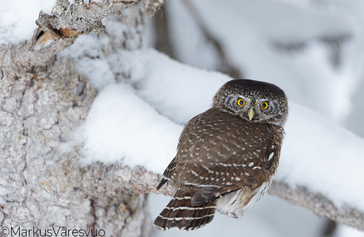 Aperture F-number f/4.5 Exposure Time: 1/500 ISO: 2500 Image information: Pygmy Owl (Glaucidium passerinum) Kuusamo Finland February 2023. Time from camera: 2021:02:06 Copyright: Markus Varesvuo Pursilahdenranta 2B22 00980 Helsinki Finland +358405033831 markus.varesvuo@lintukuva.fi Camera: Canon EOS R5 Focal Length: 600/1 | |