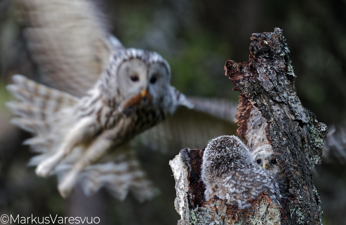 Aperture F-number f/4.0 Exposure Time: 1/60 ISO: 1600 Image information: Ural Owl bringing food to chicks (Strix uralensis) Kuusamo Finland June 2011 Time from camera: 2011:06:05 Copyright: Markus Varesvuo Pursilahdenranta 2B22 00980 Helsinki Finland +358405033831 markus.varesvuo@lintukuva.fi Camera: Canon EOS-1D Mark IV Focal Length: 500/1 | |