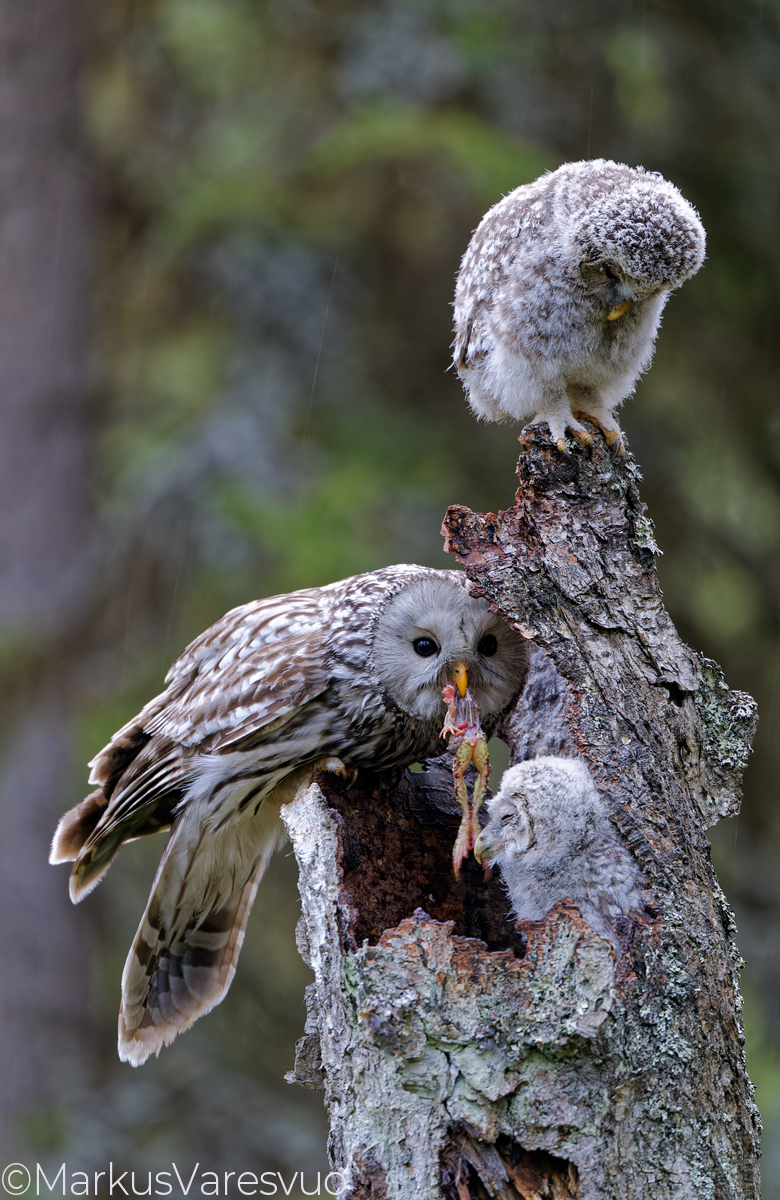 Aperture F-number f/4.0 Exposure Time: 1/25 ISO: 1600 Image information: Ural Owl brings a frog to nest for the chicks (Strix uralensis) Kuusamo Finland June 2011 Time from camera: 2011:06:04 Copyright: Markus Varesvuo Pursilahdenranta 2B22 00980 Helsinki Finland +358405033831 markus.varesvuo@lintukuva.fi Camera: Canon EOS-1D Mark IV Focal Length: 500/1 | |