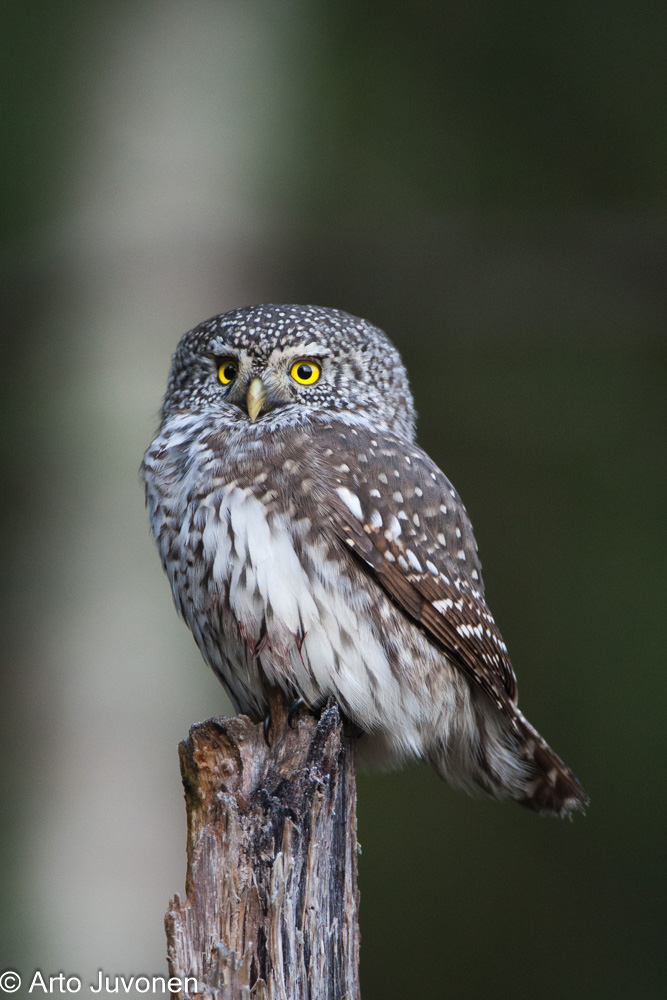 Aperture F-number f/6.3 Exposure Time: 1/320 ISO: 2000 Image information: Glaucidium passerinum, (IN)Eurasian Pygmy Owl, (EN) Pygmy Owl, (US)Eurasian Pygmy Owl , (FI) varpuspöllö, (DE) Sperlingskauz, (SV) Sparvuggla, (FR) Chevêchette d'Europe, (ES) Mochuelo alpino, (CA) Mussol menut, (IT) Civetta nana, (NL) Dwerguil, (DA) Spurveugle, (NO) Spurveugle, (PT) Mocho-pigmeu. Finland Time from camera: 2008:11:02 Copyright: Arto Juvonen Camera: Canon EOS-1D Mark III Focal Length: 700/1 | |