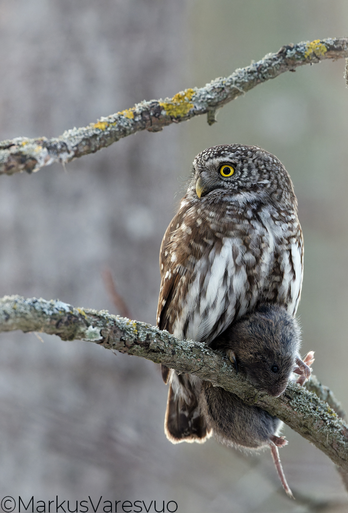 Aperture F-number f/5.0 Exposure Time: 1/2000 ISO: 8000 Image information: Pygmy Owl (Glaucidium passerinum) Helsinki Finland March 2024. Has just caught a Short-tailed field vole (Microtus agrestis). Time from camera: 2024:03:10 Copyright: Markus Varesvuo Pursilahdenranta 2B22 00980 Helsinki Finland +358405033831 markus.varesvuo@lintukuva.fi Camera: Canon EOS R3 Focal Length: 600/1 | |