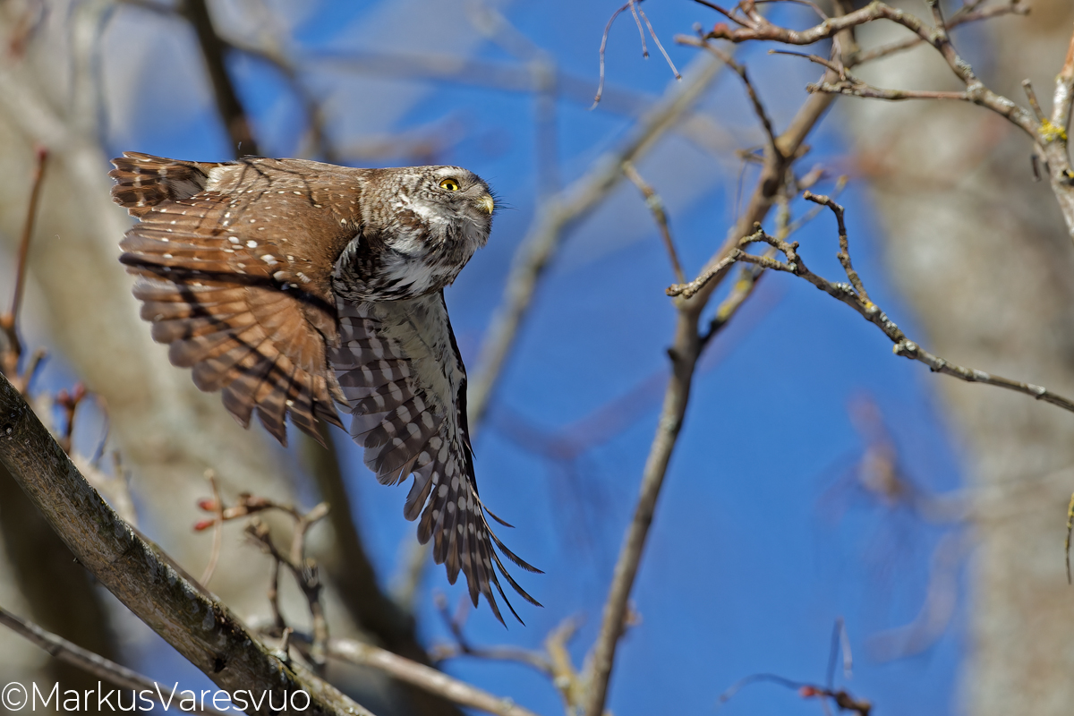 Aperture F-number f/9.0 Exposure Time: 1/6400 ISO: 5000 Image information: Pygmy Owl (Glaucidium passerinum) Helsinki Finland March 2024. Has just caught a Short-tailed field vole (Microtus agrestis). Time from camera: 2024:03:10 Copyright: Markus Varesvuo Pursilahdenranta 2B22 00980 Helsinki Finland +358405033831 markus.varesvuo@lintukuva.fi Camera: Canon EOS R3 Focal Length: 600/1 | |