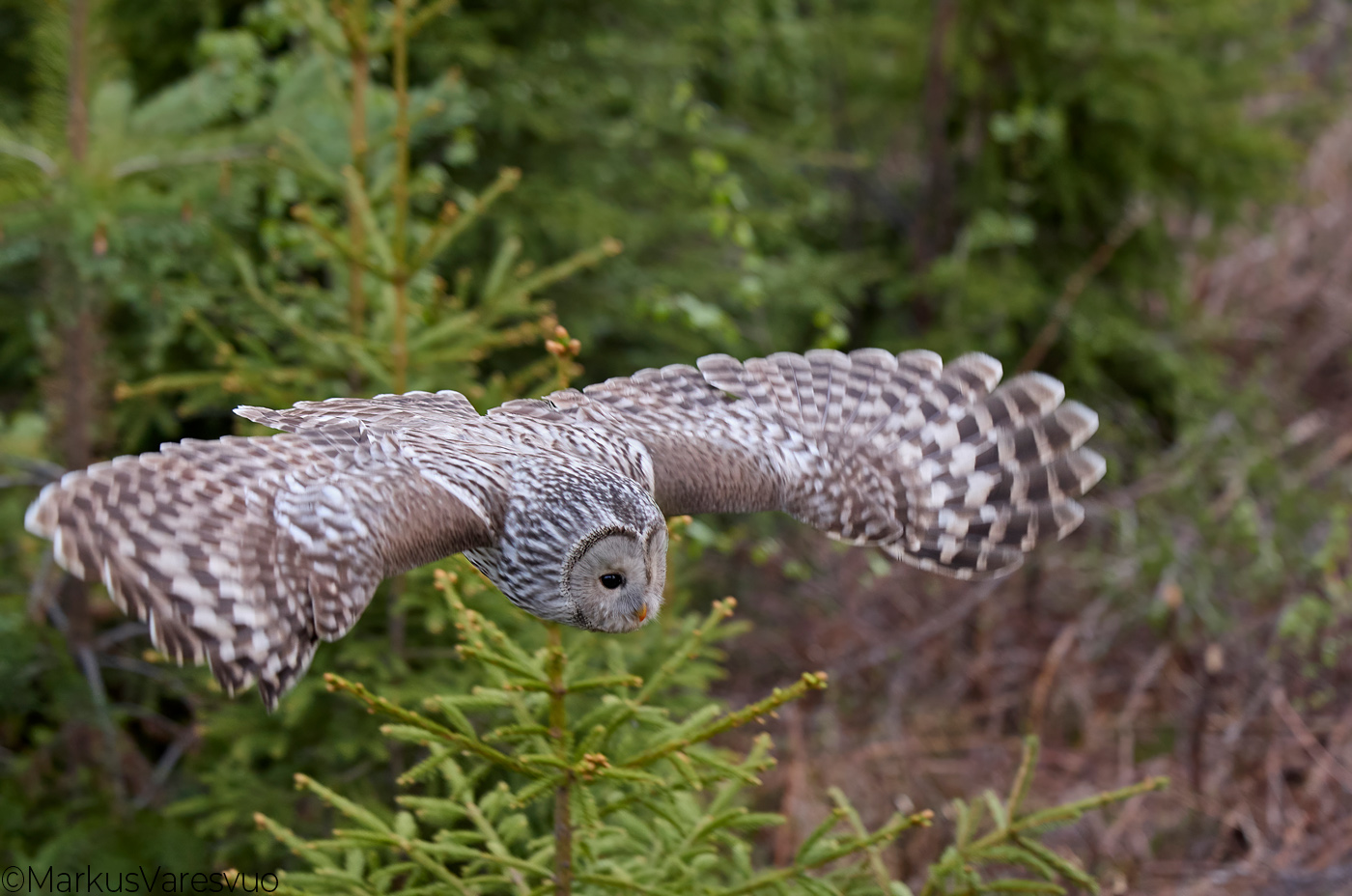 Aperture F-number f/2.8 Exposure Time: 1/640 ISO: 2500 Image information: Ural Owl (Strix uralensis) June 2022 Mainua Finland Time from camera: 2022:06:03 Copyright: Markus Varesvuo Leikosaarentie 31B49 00990 Helsinki Finland+358405033831 markus.varesvuo@lintukuva.fi Camera: Canon EOS R3 Focal Length: 100/1 | |