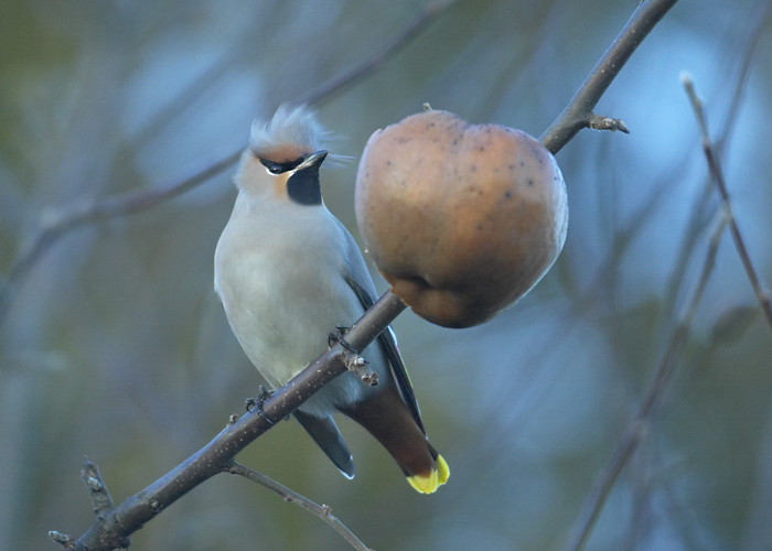 Vanhalla omakotitaloalueella oli omenapuissa vielä mukavasti syömättömiä omenoita. jonkin aikaa etsittyäni löytyi yhdestä puusta neljä tilheä niitä syömässä. Illan hiipuvissa valoissa kuvasin 500 millisellä ja canon 1d- rungolla 400 asan asetuksilla jalustalta satakunta ruutua tilhistä omenoiden kimpussa. Viikon kuvassa kova tuuli pöllyttää mukavasti tilhen töyhtöä. Valotusnopeus oli 1/200 sekunti ja se riitti pysäyttämään tilhen, mutta töyhdössä näkyy mukavasti tuulen pöllytys. |