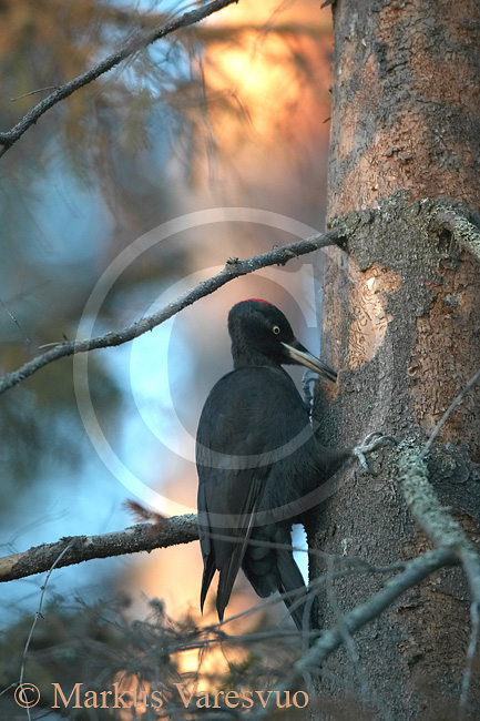 Palokärki, Black woodpecker 2.1.2004 Helsinki, Finland. Canon Eos 1Ds+ 500mm 4.0, 1/125s, F4.0, Iso 400 Tammikuu on alkanut hienoilla kuvauskeleillä Etelä- Suomessa. Aurinkoisia pakkaskelejä on riittänyt mukavasti. Ainoa kuvauksia haittaava tekijä on se, että maa on lähes lumeton ja erityisesti metsässä kuvatessa valoa on niukasti ja jos aurinko sattuu johonkin kohtaan paistamaan on valon ja varjon kontrasti hyvin jyrkkä ilman lumen tasoittavaa vaikutusta. Viikon kuvaksi valitsin palokärjen kaluamassa kuusen runkoa aikaisessa aamuvalossa. Itse lintuun tulee vain hajavaloa ja taustan mäntyihin osuva suora auringon paiste valaisee ne punertaviksi.
