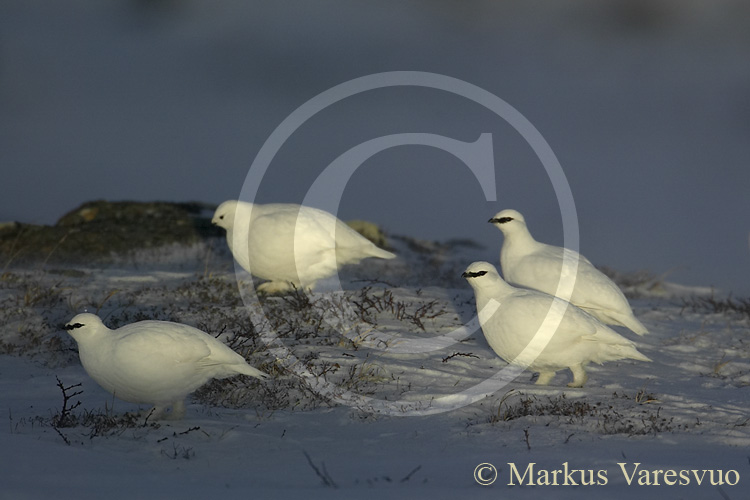 Viikon kuva kiiruna(lagipus mutus) This weeks photo is Ptarmigan Utsjoki 7.3.2004 Canon 1D+500mm(f4.0)+ 1.4x, 1/2700sec. f5.6, 200 asa Viime viikolla tein kuvausmatkan Antti Belowin kanssa Pohjois- Norjaan Varanginvuonolle. Matkalla pysähdyimme päiväksi Utsjoelle kuvaamaan Kiirunoita. Utsjokelaisen Jame Helanderin opastuksella pääsimme hyville kiirunamaille.Reilun puolentoista tunnin etsinnän jälkeen löysimme ensimmäisen parven ja kuvaaminen saattoi alkaa. Keli oli aluksi melko pilvinen ja tuulinen. Päivän kallistuessa iltapäivään keli parani ja meitä hemmoteltiin hienoilla valoilla ja useilla kiirunaparvilla, joista suurimmassa oli 25 lintua. Viikon kuvassa kolme kiirunakoirasta ja yksi naaras poseeraavat laskevan auringon valossa pienen tunturiharjanteen laella.