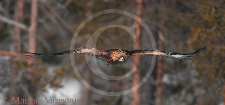 Viikon kuva Maakotka(Aguila Chrysaetus) This weeks photo is Golden Eagle Posio 26.3.2004 Canon 1Ds+500mm(f4.0)+ 1.4x, 1/1600sec. f5.6, 200 asa Viime viikolla minulla oli kunnia päästä kuvaajalegenda Hannu Hautalan kanssa hänen kotkakojulleen Posiolle. Ensimmäinen päivä meni harmaassa pilvikelissä ilman erityisiä tapahtumia. Illalla sää selkeni ja ennuste lupasi hyvää keliä seuraavaksi päiväksi ja odotukset olivat korkealla. Aamu valkeni kuitenkin harmaana ja puoleen päivään mennessä eivät edes korpit olleet vierailleet haaskalla. Alkuiltapäivästä pilvipeite repesi ja korppejakin rupesi ilmaantumaan lähipuihin tarkkailemaan tilannetta. Korppien kotkahälytyksen saattelemana suoaukean laitaan ilmaantui maakotka istumaan korkean männyn latvukseen. Tovin tarkkailtuaan se aloitti rauhallisen liuin kohti haaskaa. Viikon kuvaksi valitsin lähes suoraan kuvaajaa kohti liukuvan maakotkan