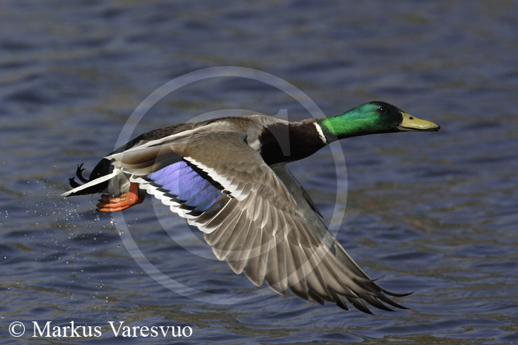 Viikon kuva Sinisorsa(Anas Platyrhynchos) Photo of the week is Mallard Helsinki 25.4.2004 Canon 1D Mark II+500mm(f4.0), 1/3200sec. f7.0, 400 asa Pari ensimmäistä kuvauspäivää takana uuden kameran kanssa. Kävin testaamassa automaattitarkennuksen toimivuutta lentäviin lokkeihin ja sorsiin. Tarkennus tuntuu toimivan varsin hyvin ja kuvan pieni kohina herkillä ISO- asetuksilla oli ilo omin silmin havaita. Viikon kuvassa sinisorsakoiras spurttaa lentoon.