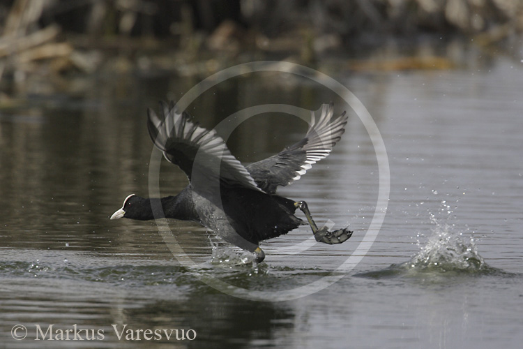Viikon kuva nokikana(Fulica Atra) Photo of the week is Coot Espoo 1.5.2004 Canon 1D Mark II+500mm(f4.0)+ 1.4x, 1/3200sec. f7.0, 400 asa Espoon Finnoon lintualtailta löytyy aina kuvattavaa. Pääsin seuraamaan nokikanan ja liejukanan reviirikiistaa, joka kesti reilun tunnin. Nokikana ajoi kerta toisensa jälkeen sitkeästi sen reviirille yrittäneen liejukanan pakosalle. Viikon kuvassa nokikana puolittain lentää ja puolittain juoksee veden päällä ajaakseen liejukanan pakosalle.