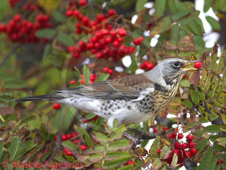 Viikon kuva räkättirastas(Turdus pilaris) Photo of the week is Fieldfare Hanko, Finland 3.10.2004 Canon 1D Mark II+500mm(f4.0), 1/200sec. f4.0, 640 asa Suuret rastas- ja tilhiparvet pyörivät parhaillaan Etelä- Suomen pihlaja- marjojen kimpussa. Viikon kuvassa herkuttelee räkättirastas.