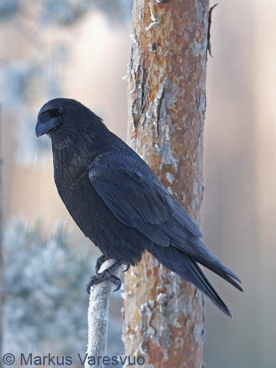 Viikon kuva korppi(Corvus corax) Photo of the week is Raven Anjalankoski, Finland 9.2.2005 Canon 1Ds Mark II+ 300mm(f2.8), 1/160sec. f2.8, 400 asa Viikon kuvassa korppi kerää rohkeutta laskeutua haaskalle.Aurinko on juuri noussut ja värjää pastellisävyin kuvan taustan.