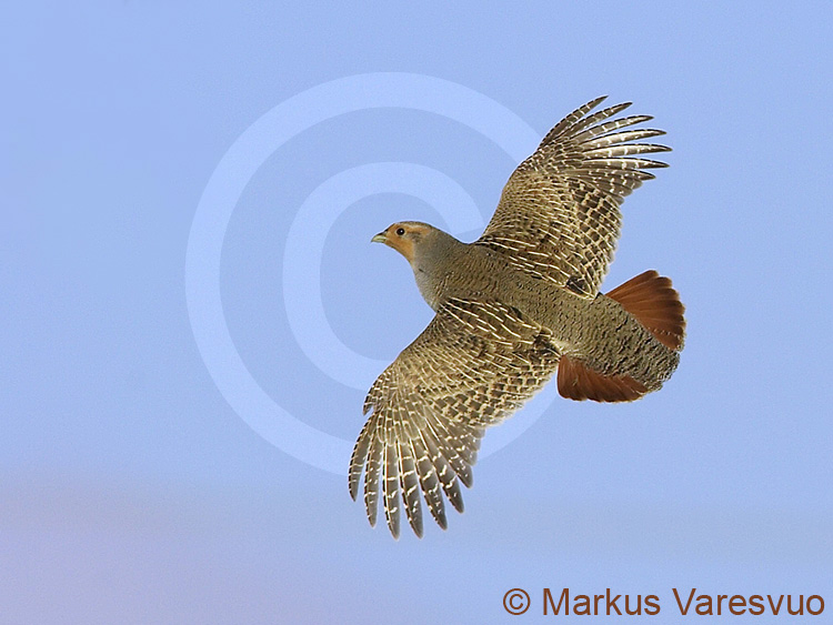 Viikon kuva peltopyy(Perdix perdix) Photo of the week is Grey Partridge Liminka, Finland 26.2.2005 Canon 1D Mark II+ 300mm(f2.8)+1.4x, 1/3200sec. f6.4, 400 asa Viikon kuvassa lentää peltopyy. Lisää peltopyykuvia nähtävillä peltopyykansiossa Kiitokset Minna Rautiolle ja Jari Peltomäelle yhteistyöstä!