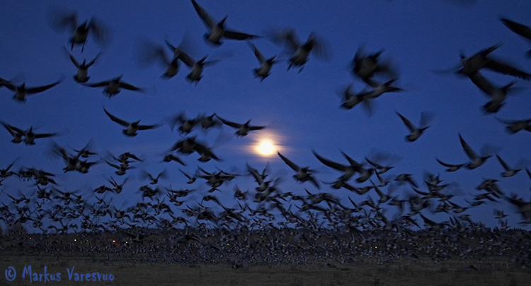 Helsinki Finland 15.10.2008 Canon 1D MarkIII, 35mmF2.0, 1/50sec. f2.0, 3200 asa Viikon kuvassa osa Helsingin Viikissä ruokailleesta n.2000 valkoposkihanhen parvesta lähtee kohti yöpymispaikkaansa. Kiitokset Esa Pienmunteelle ja Antti Belowille!