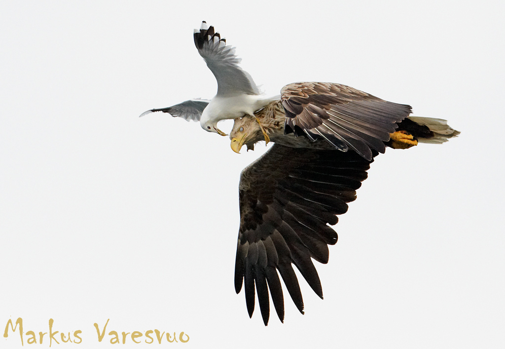 Norway 21.7.2010 Canon 1D MarkIV, 500mmF4.0, 1/2500sec. f6.4, ISO 1000. Viikon kuvassa kalalokki ratsastaa merkikotkan niskassa ja repii nokallaan höyhenen irti merikotkan päästä.
