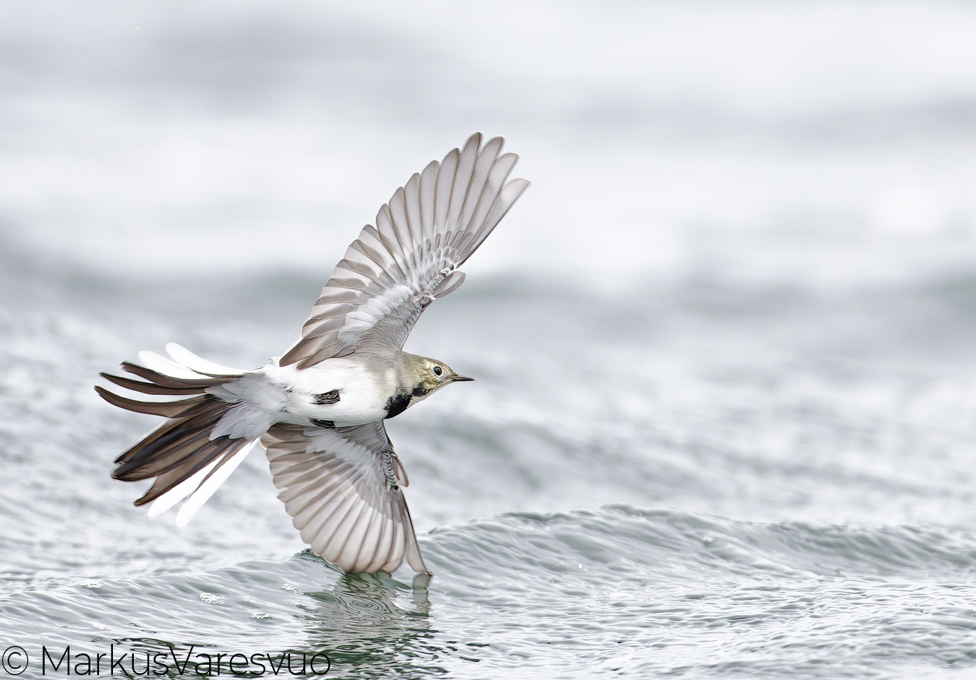 10 August 2023 Utö Finland. Kova tuulenpuuska yllätti veden päällä lentävän västäräkin, joka oli päätyä veteen sen seurauksena. RF600mm F4.0, 1/3200s, F4.0, ISO6400.