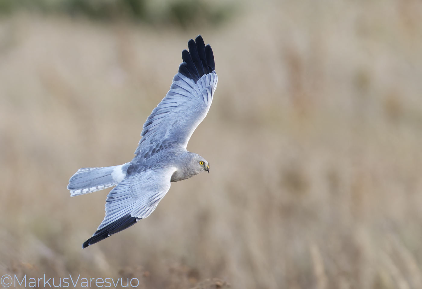 Vanha sinisuohaukkakoiras saalistamassa Utön itäniityllä.