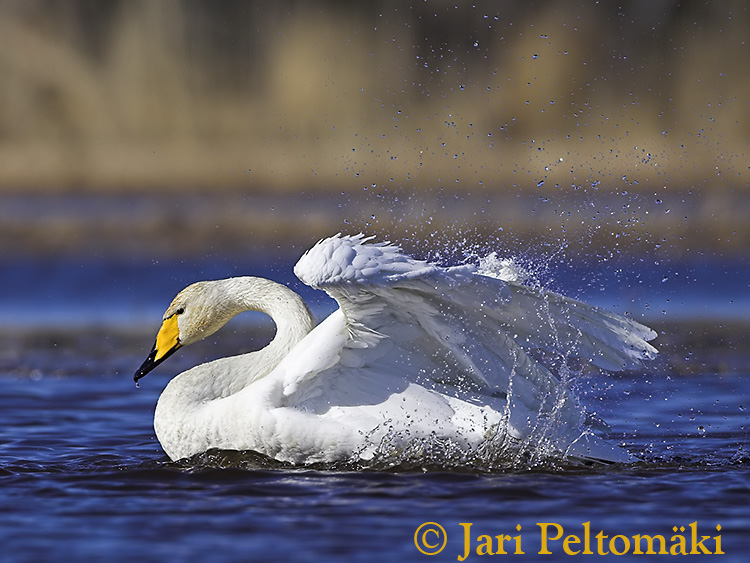 | Viikon kuvassa on laulujoutsen Photo of the week is Whooper Swan Canon 1D Mark II + 500 mm f4 IS USM, 1/2700 sec, f/6.3 (ISO 200) Kuluneella viikolla teimme Toppisen Erkin kanssa "hämärähommia"; eli raahasimme monena yönä piilokojuja kurapellolta toiselle. Emme antaneet periksi ja lopulta löysimme myös oikeat paikat, jossa linnut hyväksyivät kojumme. Loppuviikosta päästiin vihdoin myös itse asiaan ja myös kuvattiin hanhia ja joutsenia. Hanhet vielä hieman arastelivat kojua, mutta joutsenet sensijaan kylpivät kojun edessä niin että vesi lensi komeasti! Toivottavasti tulevalla viikolla ehdin vielä kuvaamaan, niin ensi kerralla voisi olla vaikka hanhi viikon kuvana? Kiitos ystävälleni Erkki Toppiselle hyvästä yhteistyöstä!