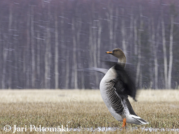 | Viikon kuvassa on metsähanhi Photo of the week is Taiga Bean Goose Canon 1D Mark II + 500 mm f4 IS USM, 1/60 sec, f/18 (ISO 400) Takatalvea melkein koko viikon ajan. Toisaalta hyvä, sillä vielä viime viikolla tuntuikin, että kevät menee aivan liian äkkiä ohi! Nyt sensijaan muutto on ollut seisahduksissa ja ensimmäisen muuttoaallon hanhetkin ovat jääneet Liminganlahden pelloille ruokailemaan. Kuluneella viikolla pääsimme Erkin kanssa vihdoin kuvaamaan hanhia. Oheisessa viikon kuvassa halusin lumisateen näkymään pitkinä viiruina ja riskeerasin pitkällä suljinajalla kuvatessani leyhyttelevää hanhea. Usean kuvan sarjasta vain yhdessä kuvassa linnun pää oli terävä! Ensi viikko meneekin Italiassa Po Deltalla messuillessa. Jospa sielläkin ehtisi jonkun kuvan ottamaan?