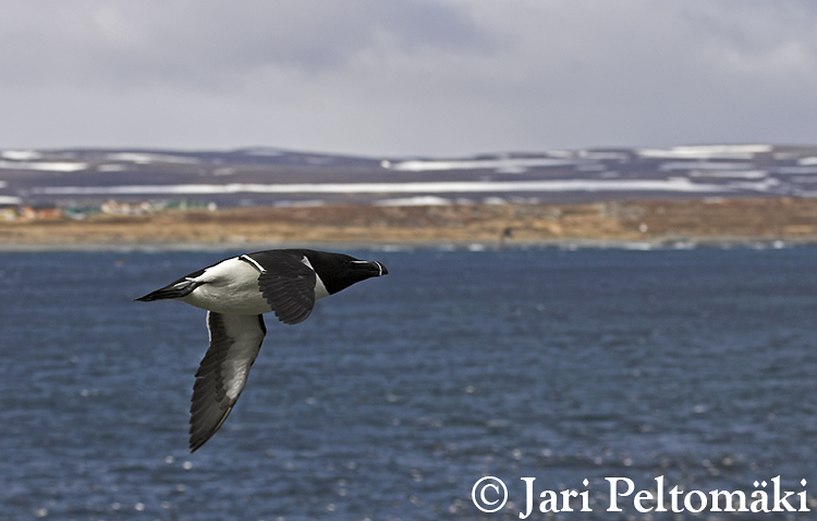 | Viikon kuvassa on ruokki Photo of the week is Razorbill Canon 20D + 100-400 mm IS USM (at 100 mm), 1/1250 sec f/10.0 (ISO 400) Viikko vierähti opastushommissa Lapissa ja Varangilla. Olosuhteet olivat etenkin Varangilla vielä varsin talviset. Perinteinen käynti Hornoyan lintuvuorella on aina hieno kokemus ja viikon parhaat kuvaustilanteet tulivatkin sieltä. Oheisessa viikonkuvassa ruokki viilettää kovassa tuulessa aivan vierestä ohi...