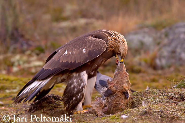 | Viikon kuvassa on maakotka Photo of the week is Golden Eagle Canon 1D Mark II + 300 mm (f/2.8) IS USM + 2 X converter, 1/60 sec f/6.4 (ISO 200) Suomi on Siperiaa! Kulunut viikko oli synkkä ja sateinen. Vaikka Oulun ja Hesan välillä lentokoneesta käsin totesin auringon olevan taivaalla, niin paksu pilvikerros esti tehokkaasti valon pääsyn maan pinnalle asti. Siispä uusia kuvia ei tällä viikolla syntynyt, vaikka kohteita olisi ollutkin liikkeellä. Hyviä uutisia kantautui Kemilän Eeron kanssa aloittamaltamme kotkanruokintapaikalta, sillä vanha kotka oli istuskellut puussa aivan ruokintapaikan ja kojun vieressä! Joten eiköhän taas tänä talvena päästä kuvaamaan kotkia? Oheisessa noin vuosi sitten otetussa kuvassa "kotka suutelee kettua" ;) Kyseessä lienee harvemmin dokumentoitu tapahtuma?