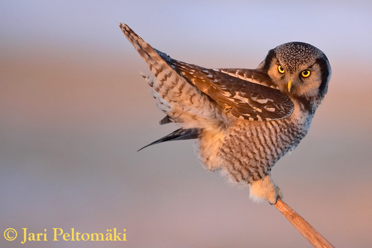 | Viikon kuvassa on hiiripöllö Photo of the week is Hawk Owl Canon 1D Mark II + 500 mm (f/4) IS USM, 1/1300 sec f/4 (ISO 800) Tällä viikolla kuvasimme Markus Varesvuon kanssa muutaman päivän koko valoisan ajan lintuja Oulun seudulla. Kahtena päivänä matalalta paistava aurinko oli kanssamme, mutta lyhyeen talvipäivään ei valitettavasti mahdu kovin montaa tilannetta! Onnemme olikin vaihtelevaa, mutta onnistuimme kumpikin saamaan joitain ihan mukavia ruutuja hiiripöllöistä ja isolepinkäisistä.
