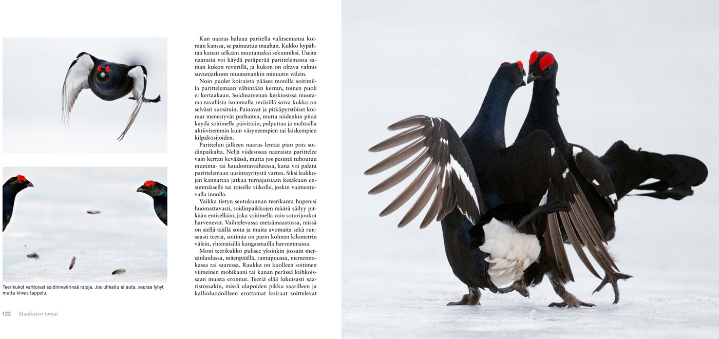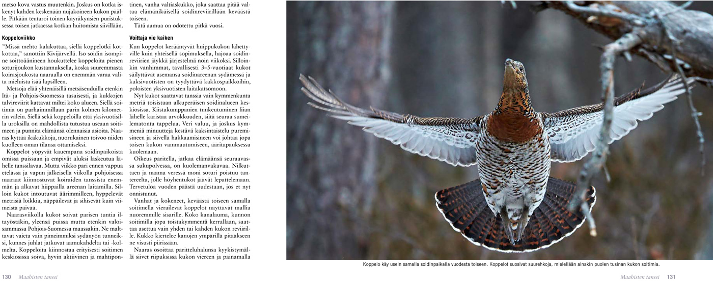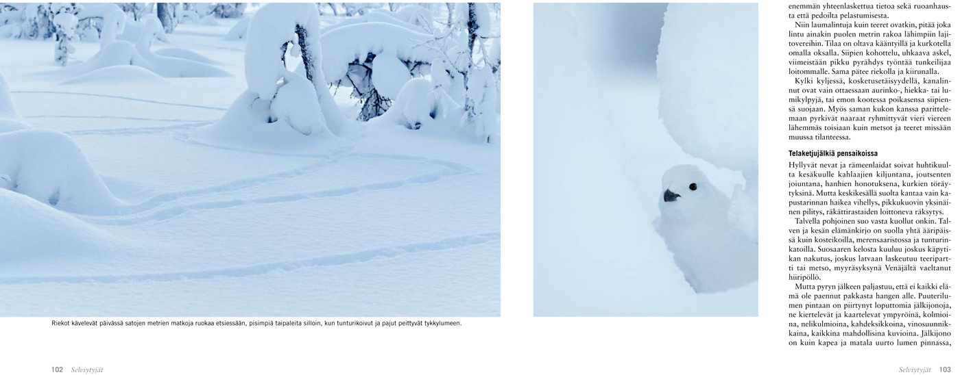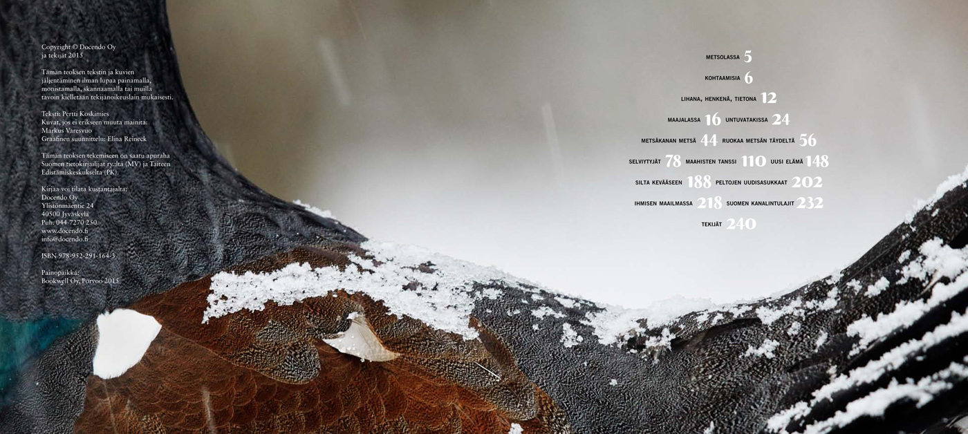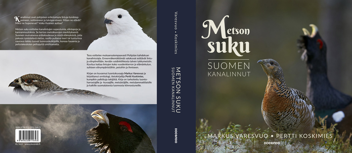 METSON SUKU — SUOMEN KANALINNUTM. Varesvuo, P KoskimiesKanalinnut ovat pohjoisen erikoisimpia lintuja lumikieppeineen, soitimineen ja talviparvineen. Miten ne elävät? Miksi ne hupenevat? Voiko ihminen auttaa? Metson suku esittelee kanalintujen sopeutumia, elintapoja ja kannanmuutoksia. Se kertoo metsäkanojen merkityksestä Suomen muinaisessa erätaloudessa ja niistä elämyksistä, joita pakoon rymistelevä metso, suolla puliseva teeri tai tunturissa naurava riekko tuovat luonnonkulkijoille, koreaa fasaania ja peltolakeuksien peltopyitä unohtamatta. Teos esittelee mukaansatempaavasti Pohjolan kahdeksan kanalintulajia. Ennennäkemättömät valokuvat esittävät lintuja elinpiireillään, kevään soidinkiihkosta talven tykkymetsiin. Kuvitus kattaa lintujen koko vuodenkierron ja elämänkulun, suhteen elinympäristöihin, petoihin ja ihmiseen. Kirjan on kuvannut luontokuvaaja Markus Varesvuo ja kirjoittanut ornitologi, tietokirjailija Pertti Koskimies, kumpikin palkittuja tekijöitä. Kirja on tarkoitettu luontoharrastajille ja -kuvaajille, metsästäjille, metsäammattilaisille ja kaikille suomalaisesta luonnosta kiinnostuneille. Kustantaja Docendo, taittaja Elina Reineck |