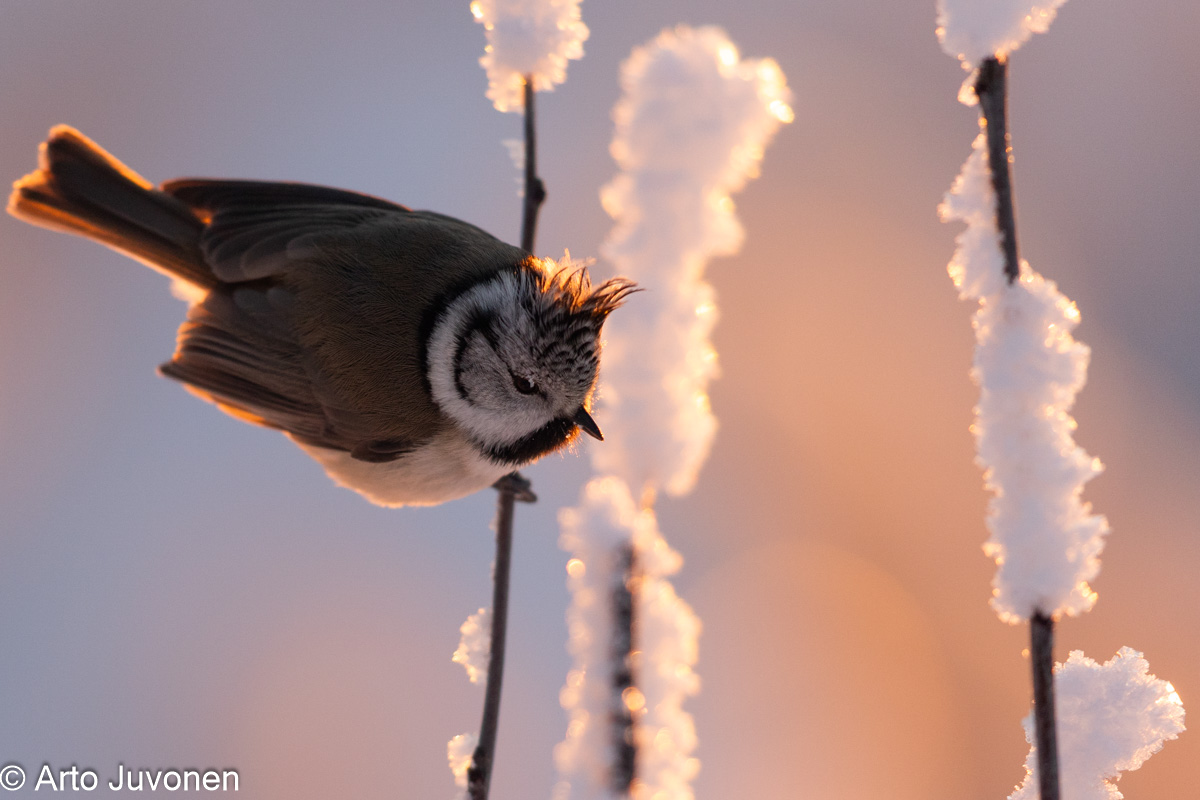 Tämä aamu oli ennustetusti talven toistaiseksi kylmin, tyyni ja kirkas. Pitkän kirkkaiden pakkasaamujen jakson jälkeen sain vihdoin itseni kuvaustöihin metsäruokinnalle, mutta vähän myöhässä. Aurinko oli juuri ilmestymässä näkyville, kun saavuin ruokintapaikalle. Myöhästyin, sillä en saanut autoa käyntiin ilman pientä lämmitystä. En sitten ehtinyt järjestää mitään studiota ennen valoja, mutta toisaalta aamutuokio jäi pakkasessa siedettävän pituiseksi. Jonkun kohtuulisen vastavalokuvankin sain vaivan palkaksi. Onhan tämä kovaa aikaa linnuille. Pöllötkin näyttävät ilmaantuvan metsistä. Tänään näin lehtopöllön saalistelemassa päivän valossa, eilen viirupöllön. Viirupöllön saalisonnen perusteella myyriä on ainakin paikoin hyvin, sillä pöllö nappasi lyhyen seurannan aikana kolme myyrää.