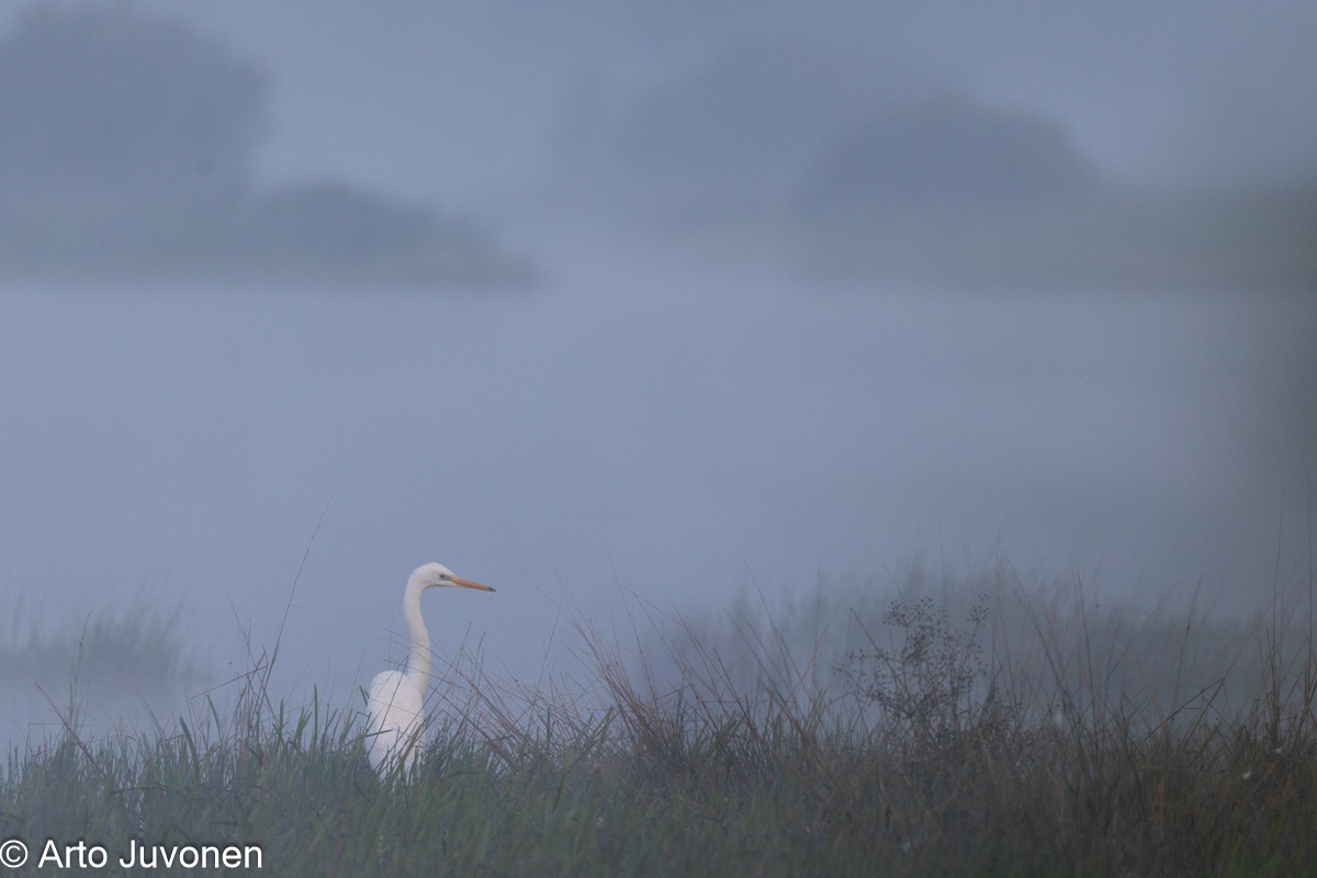 Jaahas, että taas jalohaikara viikkarina, tällä kertaa aamuvarhaisen usvaisessa maisemassa. Eipä ole muuta kelvollista tarjolla. Olisi ollut arosuohaukka, ellen olisi taas kerran mokannut asetusten kanssa. Vajaan parin tunnin kiikarointi Laisniemen peltoaukeilla oli taas kerran antelias tarjonnallaan. Paras oli vanha, vahvasti sulkasatoinen arosuohaukkakoiras, haukkojen kaunokainen vaikka vähän repaleisin siivin. Arosuo laskeutui paikalliseksi vähän matkan päähän tien suuntaan kivelle. Otin dokumenttikuvat 1/200 sekunnin valotusajalla, jonka jälkeen päätin ajaa autolla lähemmäksi ottaakseni paremmat kuvat kauniisti kivellä patsastelevasta haukasta. Noh, kun tulin kohdalle arosuohaukka nousi ja lensi aivan vieritse tien toiselle puolen, enkä tosiaan älynnyt muuttaa asetuksia. 1/200 sekunnin valotus ja läheltä ohi pyyhältävä haukka - tuloksen pelkkää suttua. Näitä tapahtuu minulle liian usein, eikä varmasti ole toivoa paremmasta ikävuosien edelleen kertyessä.