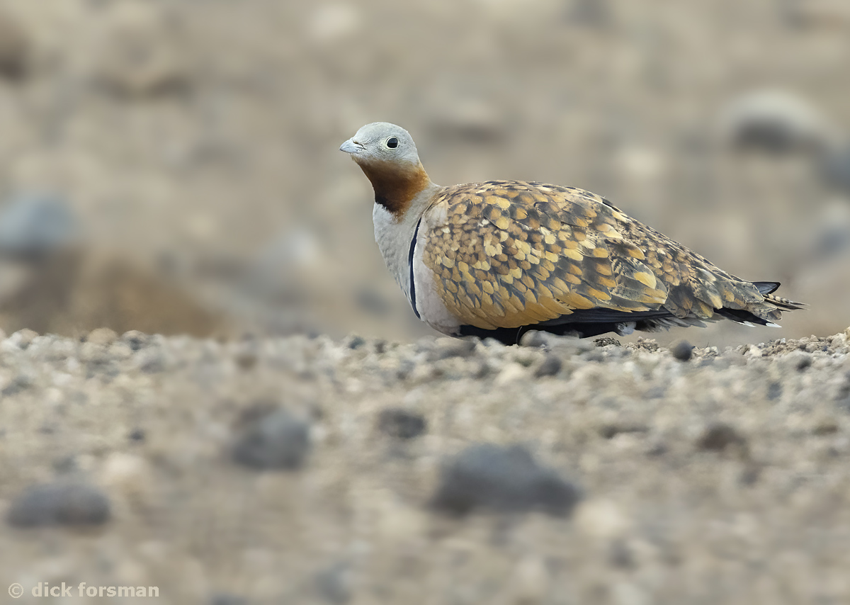 A handsome male Black-bellied Sandgrouse (Pterocles orientalis) is looking for something to eat in the semi-desert of Lanzarote. |