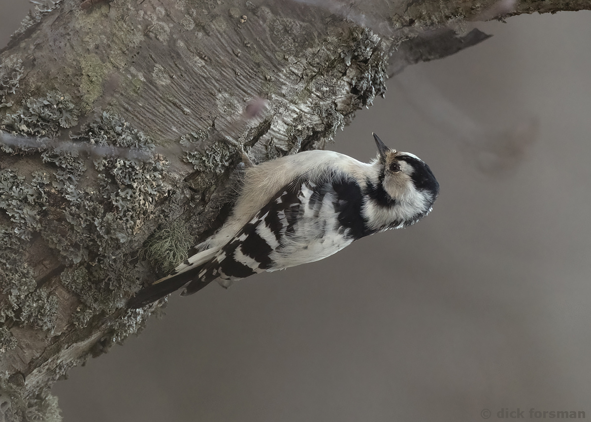 Female Lesser Spotted Woodpecker (Dryobates (Dendrocopos) minor). This female is unusually clean and white, one that stands out in the crowd.