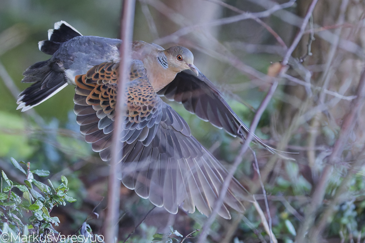 Idänturturikyyhky. Vähän on risuja edessä, mutta tuntomerkit näkyy...