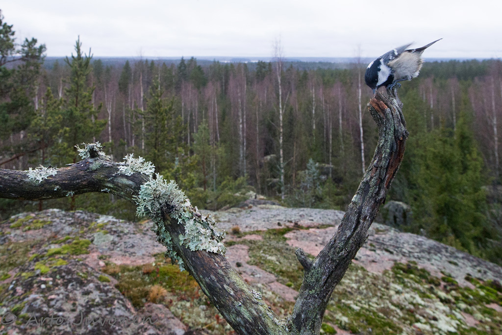 Ajankuva ruokintapaikalta. Kuusitiainen kelottuneen kalliomännyn oksalla ruokintapaikan kallion laella.