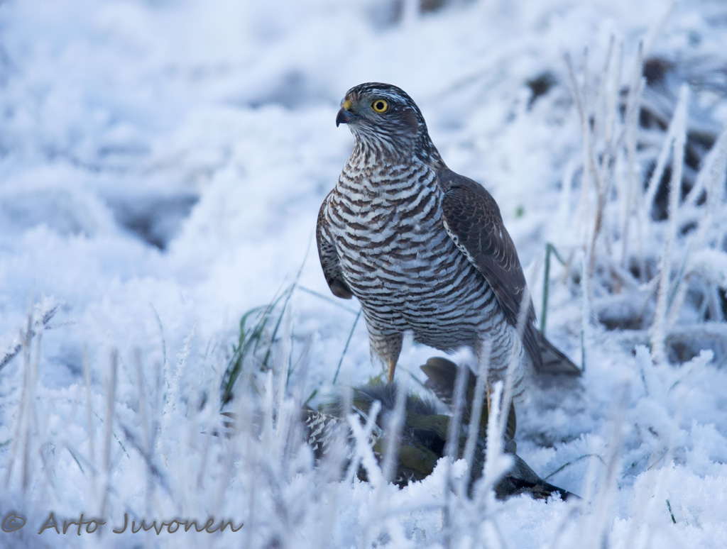 Viikkari olisi kelvannut hyvin valita joku ruokintapaikankuvista. Aamu- ja iltavaloja metsäruokinnalla kuitenkin tulee vielä, mutta viikkarivalinta on kerran-elämässä tilanteesta. Aika harvoin olen päässyt kuvaamaan varpushaukkaa saaliin kanssa, mutta että saaliina oli vieläpä harmaapäätikka, sellaista sattumaa tuskin enää tulee vastaan.
