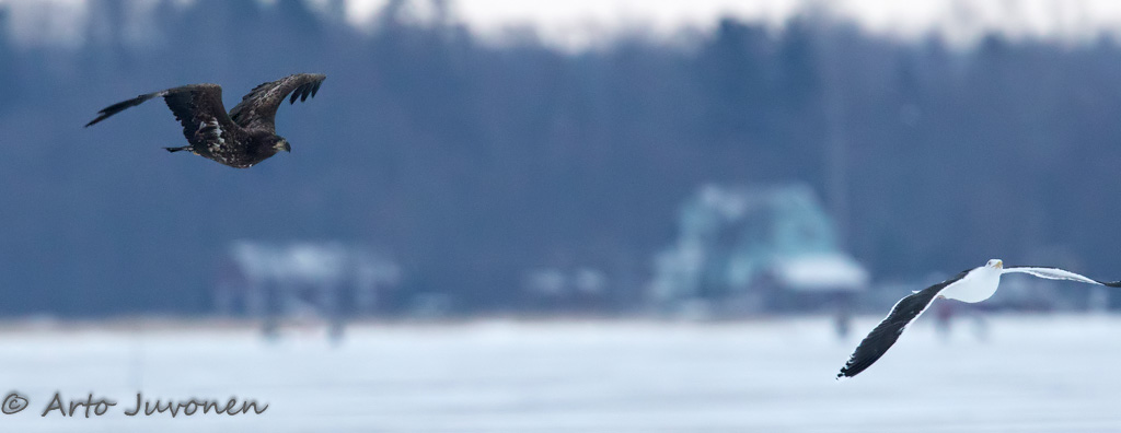 Lauantaina potkin kelkkaa runsaan kymmenen kilometrin matkan Ahvenkoskenlahden jäällä - tuloksena 14 havaittua merikotkaa, joista 11 yhtäaikaa jäällä. Haikonselällä sunnuntaina merikotkia oli seitsemän, kilometrejä kertyi varmaan sama matka kuin lauantaina, mutta pienemällä selällä enemmän ristiin rastiin tapahtumapaikalta toiselle.