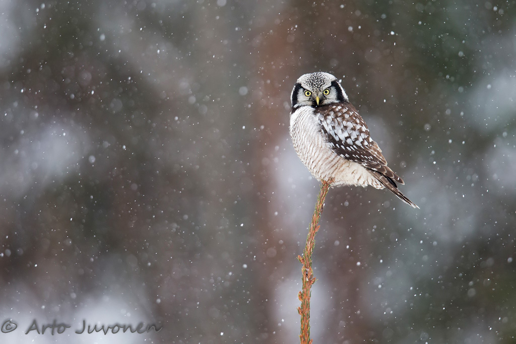 I was lucky to notice a Hawk Owl next a road on top of a not so tall tree. It was snowing quite heavily and because the Owl was not high up, possibility to get dark back ground. So I turn back and managed to get pictures I wanted to have.