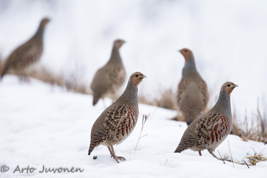 Grey Partridge is a quite rare bird here in Southern Finland. Today I managed to see two flocks. Here is part of one, that have now only seven birds in flock. Three birds have been lost since December.