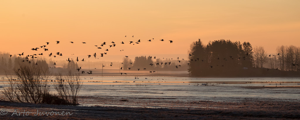 Viikkarissa Kanteleen hanhet nousevat ruokailulennolle. Isolla näytöllä täydellä pikselimäärällä kuva toimii aivan eri tasolla kuin tässä 1024 pikselin leveyteen kutistettuna.