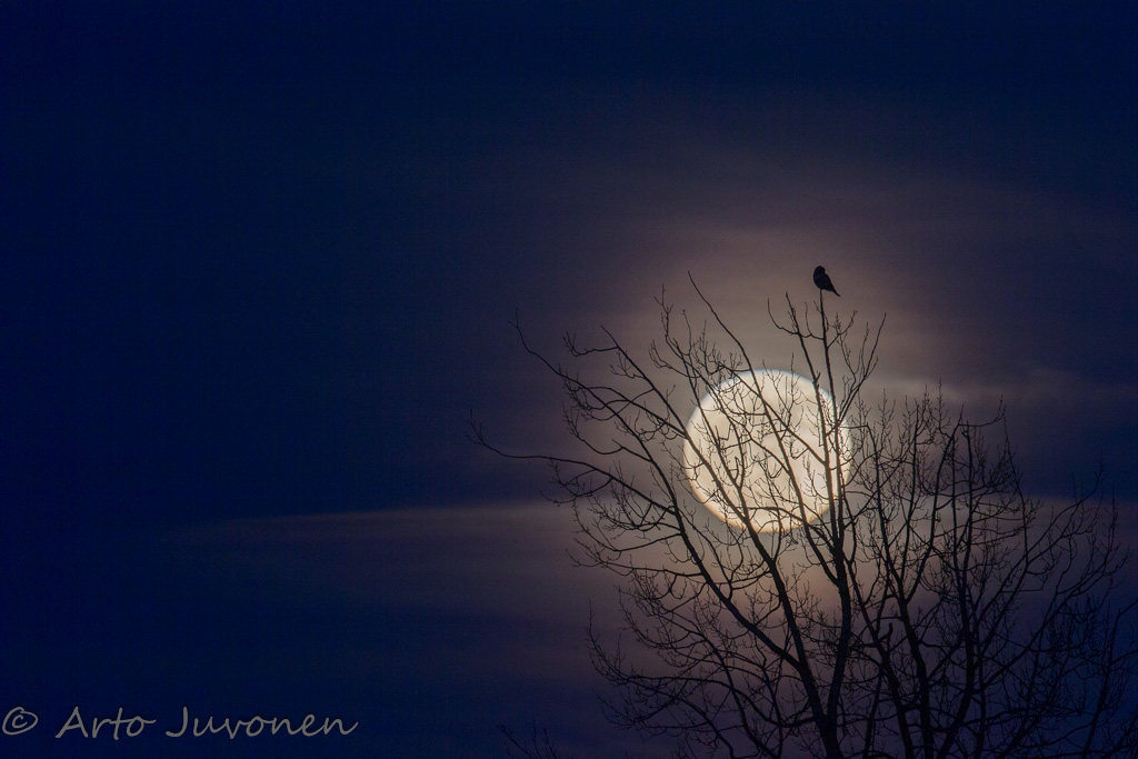 Viime viikon torstai-iltana kuu oli vähän vajaa ja aika korkealla taivaalla jo hyvän aikaa ennen auringonlaskua. Oli jo melko pimeää, kun kotimatkalla Kanteleelta näin tien vieressä langalla hiiripöllön. Kuuta vasten kuvaa piti taas yrittää, joten viritin kameran valmiiksi odottamaan tilaisuutta. Juuri sopivasti pöllö siirtyi tylsältä sähkölangalta kelon latvaan napattuaan myyrän pellosta. Paksun saven kuorruttamat kengät painoivat paljon, kun palasin mullospellolta autolle. Jotain kuvia pölllöstä ja kuusta oli taas syntynyt, mutta parempaan piti pystyä. Täyskuu oli vielä tulossa...
