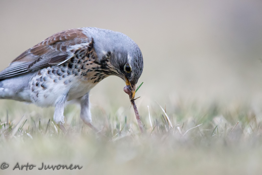 Perjantai-iltapäivänä katselin jakapallokentän nurmikolla ruokailevia rastaita. Ajattelin, että jos tuonne keskelle kenttää laitan piilokojun, rastaat vain katoavat ympäristön pihanurmikoille. Noh, ajattelin, että ainakaan en saa yhtään kuvaa, jos en yritä. Rastaat palasivat nurmikolle melkein heti, kun olin kojuun kadonnut. Vaikka tuuli lepatti kojun kankaissa ja heilutteli kuvausaukkojen suojakankaita, rastaat eivät välittäneet, vaan tulivat aivan kojuun kiinni matoja etsimään. Lyhyeksi leikattu jalkapallokentän nurmi on hyvä kuvausalusta pitkin-pintaa kuviin.