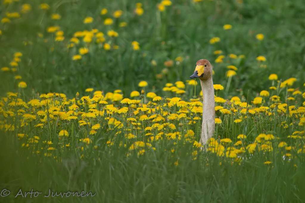 Hellejaksoa edeltäneet rankat sateet nostivat Taasianjoen pintaa niin paljon, että joessa pesineiden joutsenten pesinnät menivät virran mukana. Joutsenparilla on nyt hyvää aikaa herkutella voikukkapellossa. Tuli vaan mieleen, että johtuuko joutsenen pään värjääntyminen voikukkien siitepölystä?