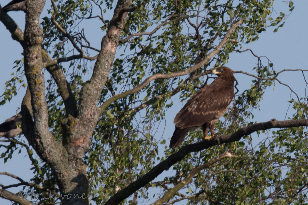 Sunnuntain osalta en saisi taaskaan mitään ilmastonsuojelupalkintoa. Kävin aamulla kaatopaikalla näkemässä kolme haarahaukkaa. Illalla olin taas kaatopaikalla. Haarahaukkoja näkyi nyt vain yksi, mutta reunuskoivussa istui rarikotka. Minä veikkasin tilanteessa pikkukiljukotkaa , mutta Tiiraan laittamani kuvan perusteella sain Petro Pynnöseltä asiantuntevan perustelun, että laji on kiljukotka. Alla on Tiirassa ollut (havainto meni salaukseen Tiirassa!) kuva, jonka määritysperusteita otan mieiellään vastaan arto@lintukuva.fi. Ai niin, kaatopaikkakeikkojen välissä käväisin Hamnskärillä toteamassa saaren olevan harvinaisen tyhjä linnuista! Matkalla sain sentään kuvata tyyellä ulapalla ruokailutta vesipääskyparia.