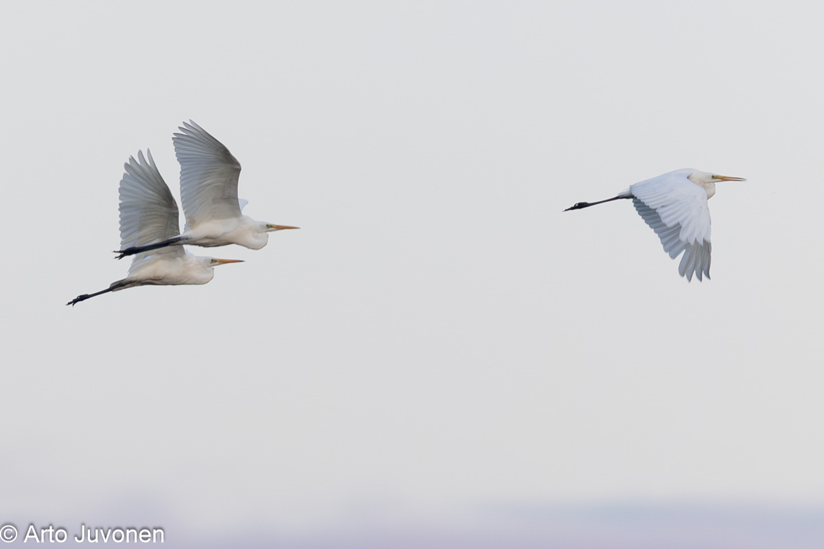 Heinäkuun lopulla jalohaikaroiden iänmääritys tarkuudella nuori/ei-nuori oli helppoa, koska lähes kaikki näkemäni jalohaikarat olivat siipisulkasadossa. Nuoruuspuvun siipisulat vaihdetaan vasta vuoden iässä, joten nuori lintu on ehjäsiipinen, eikä sen siivellä näy tässä vaiheessa kuluneita sulkia. Yleensä ikää ei kuitenkaan uskalla määrittää ilman riittävän hyvää kuvaa. Viikkarissa lentää täysin ehjäsiipinen nuori, yksi selvä repalesiipi ja kolmas, jonka sulkasato ei maastossa näy niin selvästi. Kuvasta näkee hyvässä vertailussa myös nuoren linnun kapeammat käsisulat. Jalohaikaroita pesi Itä-Uudellamaalla (ainakin) kolmessa harmaahaikarayhdyskunnassa, tosin vain yksi varmistettu pesintä per yhdyskunta. Kuinkahan paljon jalohaikaroita pesiikään Etelärannikon harmaahaikarayhdyskunnissa?