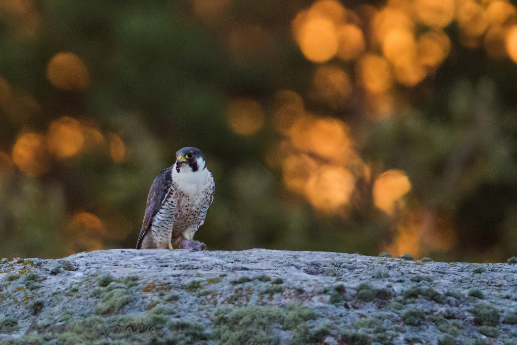 Veneestä näin pohjoisrannan kivellä harteikkaan petolinnun hahmon saalista repimässä - olisiko muuttohaukka? Ja olihan se ja vielä ihmeen rohkea. Pääsin kuvaamaan haukkaan vasten metsän takaa nousevaa aamuaurinkoa. Sentään nousi siivilleen muutaman kymmenen metrin päästä. Myöhemmin saarta kompatessani sama haukka nousi saalis edelleen kynsissään läheltä männyn oksalta, ja vielä kerran tosi läheltä kalliolta. Silloin sain taas opetuksen, ettei pitäisi olla laiska. Olin jättänyt painavan kameran olaltani kiertäessäni kärjen kallion lapinsirkkua hakiessani. Ei taida ihan kohta tulla yhtä hyvää tilaisuutta muuttohaukan kuvaamiseen. Turha toivo, että koskaan oppisin... Siispä tässä on nyt vain hippiäinen viikkarina.