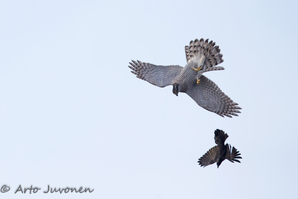 This adult male Goshawk was super singly bad hunter. It did several attacks without success. Adult Goshawks are normally very effective - so maybe he was jus palying?