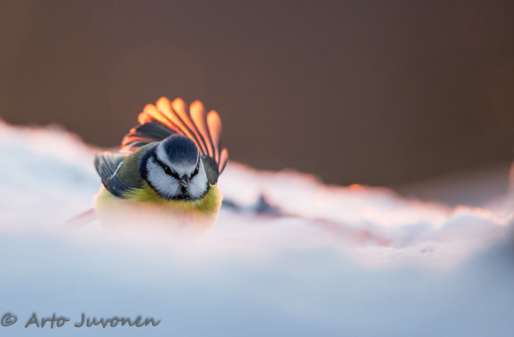Picture of a blue tit taken on the level of snow cover have got beautiful reddish tones of the rising sun.