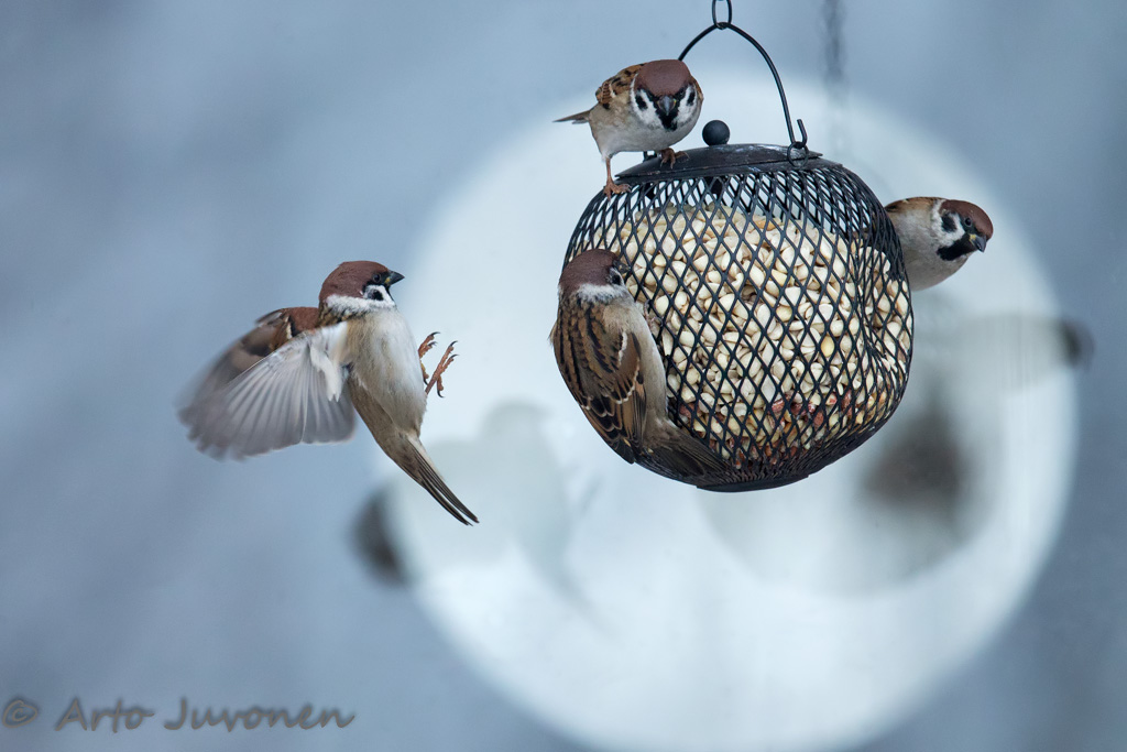 Eurasian Tree Sparrows are common visitors at my feeding place - today there was 90 exx. It is quite surprising that House Sparrows are never seen at my cottage with Tree Sparrows. House Sparrows are getting quite rare nowadays... |